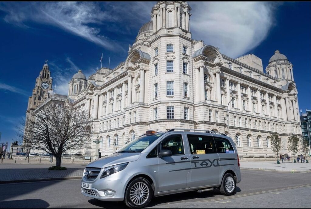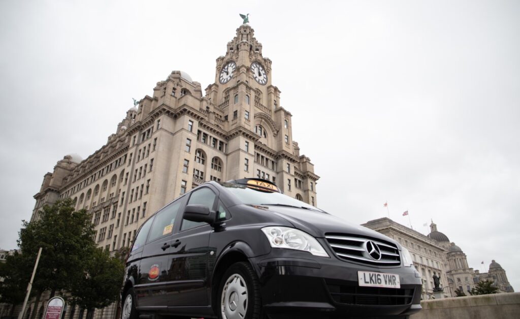 Comcab Liverpool taxi outside Royal Liver Building